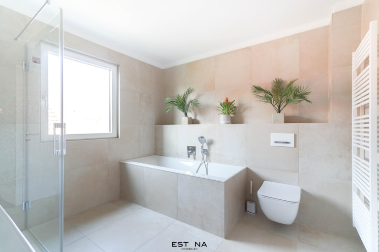 Wellness-Bad: Ein geräumiges Familienbadezimmer, das keine Wünsche offen lässt – ausgestattet mit Badewanne, separater Dusche, Doppelwaschtisch und Toilette.