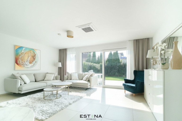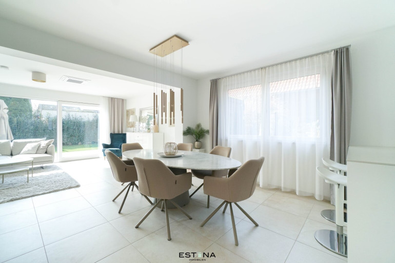 Garten-Oase: Große Glasfronten öffnen den Blick auf die Terrasse und den privaten Garten – Ihre persönliche Erweiterung des Wohnzimmers ins Grüne.