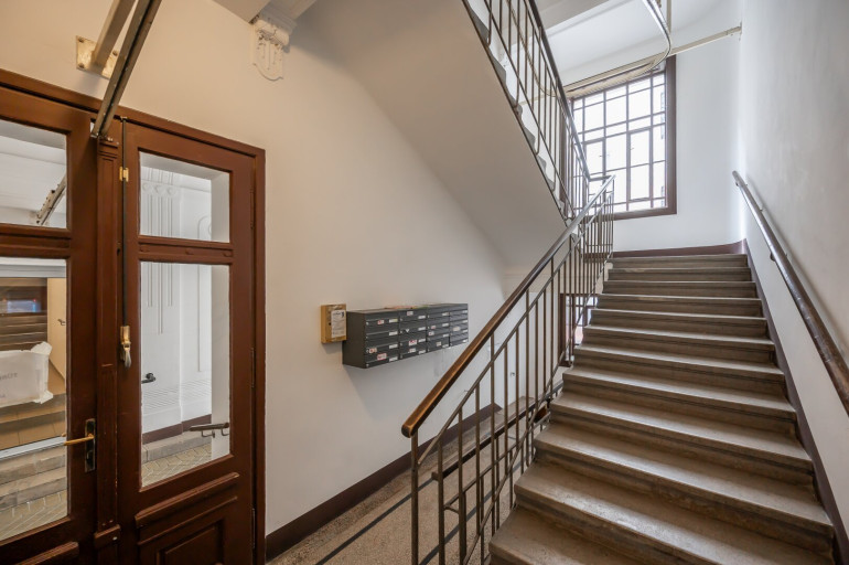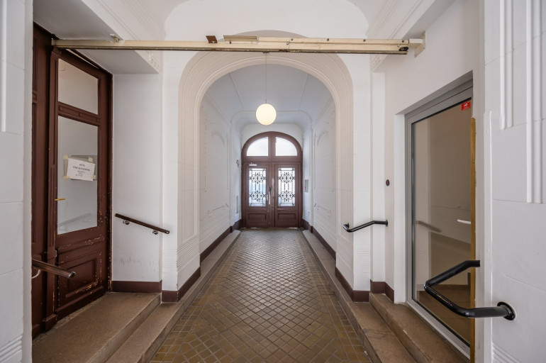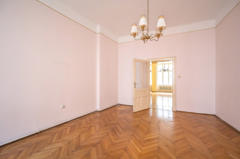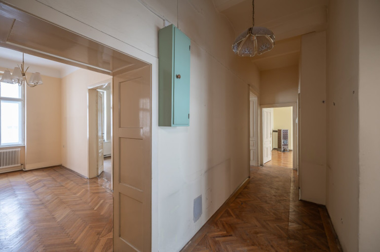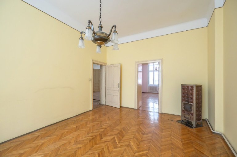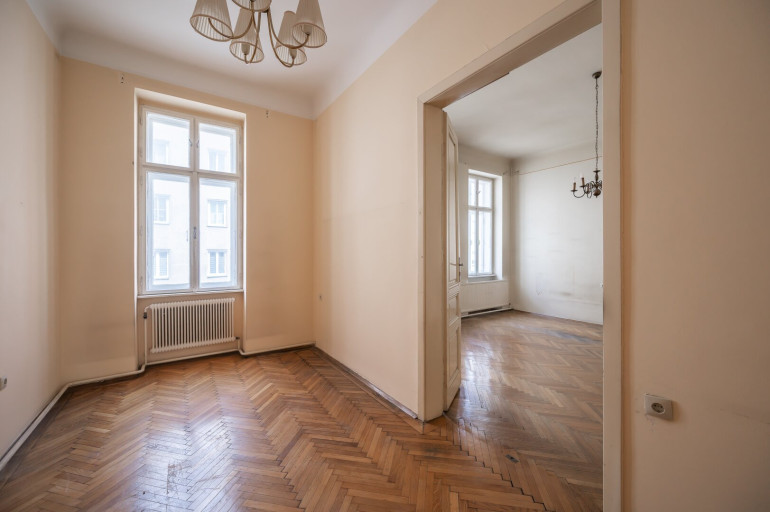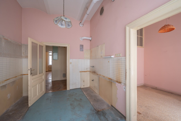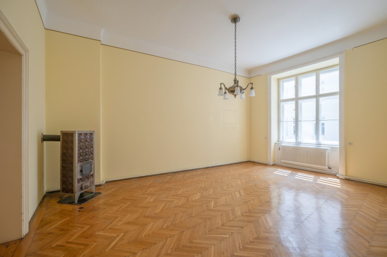 Die Wohnung befindet sich im 2. Stock (ohne Lift) und in einem sanierungsbedürftigen Zustand. Sie bietet sehr viele Elemente eines Stilaltbaus: