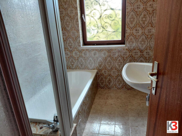 Im Erdgeschoss sind 3 Schlafzimmer, ein Wohnzimmer mit Kachelofen, eine Küche mit angeschlossenem Esszimmer, ein Bad mit Dusche und Badewanne und ein Gäste WC.