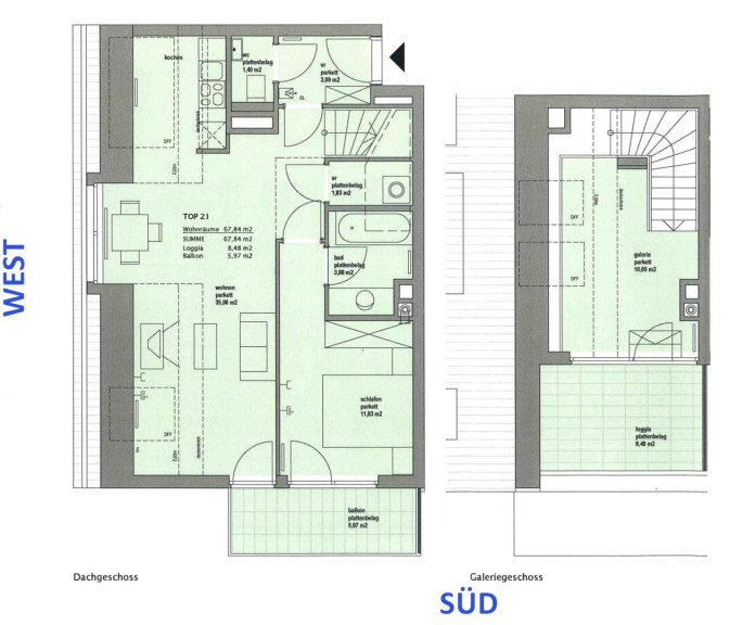 ( Vorzimmer, Südterrasse, Südloggia, Wohnesszimmer mit offener Küche, Schlafzimmer, Galerie, Badezimmer, Abstellraum, WC & Kellerabteil )