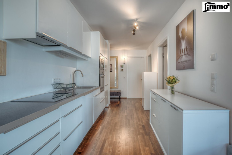 Die zeitlos gestaltete Küche fügt sich harmonisch in den offenen Wohnbereich ein. Beheizt wird die Wohnung über eine moderne Fußbodenheizung. Großzügige Glasfronten sorgen für lichtdurchflutete Räume und verbinden Innen- und Außenbereich auf elegante Weise.