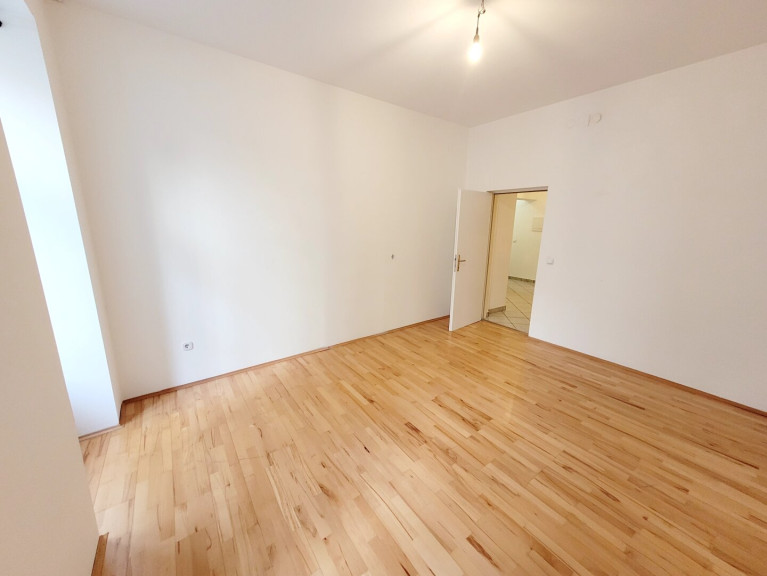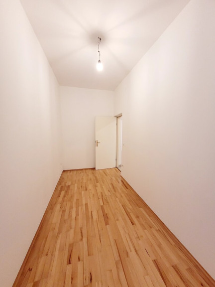 Man betritt die Wohnung über den Vorraum. Von hier sind alle Räume getrennt begehbar. Geradeaus gelangt man in die beiden großen Zimmer. Das rechte Zimmer hat einen Ausgang in den Eigengarten der direkt vor der Wohnung liegt. Das kleine Zimmer ist in den Innenhof des Hauses ausgerichtet. Die Küche ist mit einer Einbauküche eingerichtet. Das Badezimmer ist mit einer Badewanne ausgestattet. Das WC ist separat vom Vorraum aus begehbar.