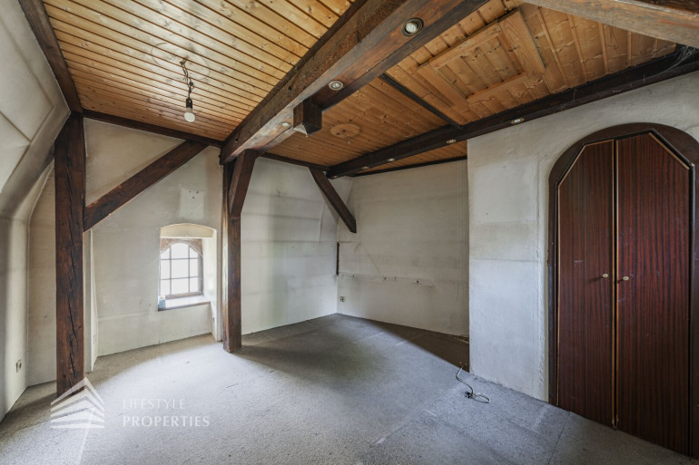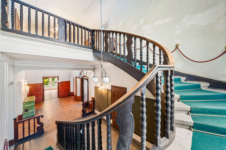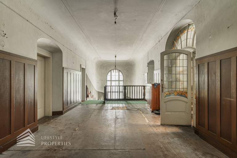 Neben dem Hauptgebäude befindet sich ein Pförtnerhäuschen, welches ebenfalls um ein Dachgeschoss ergänzt werden soll, und ein parkähnlich angelegter Garten. Hierbei würde eine Wohnfläche von unglaublichen ca. 1.019 m² entstehen.