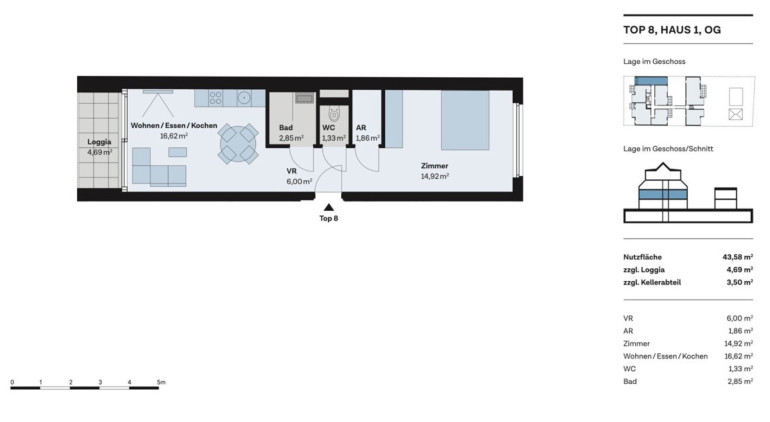 Diese 2-Zimmer-Wohnung im 1. Obergeschoss bietet auf 43 m² eine durchdachte Aufteilung: offener Wohn-Ess-Bereich mit Zugang zur Südwest-Loggia, separates Schlafzimmer, modernes Bad mit Dusche, eigenes WC. Die Anlage wurde 2018 errichtet und umfasst nur 18 Einheiten.
