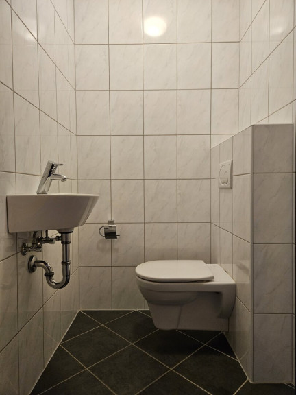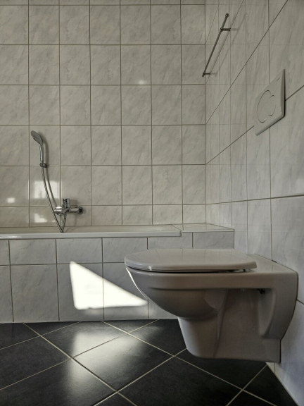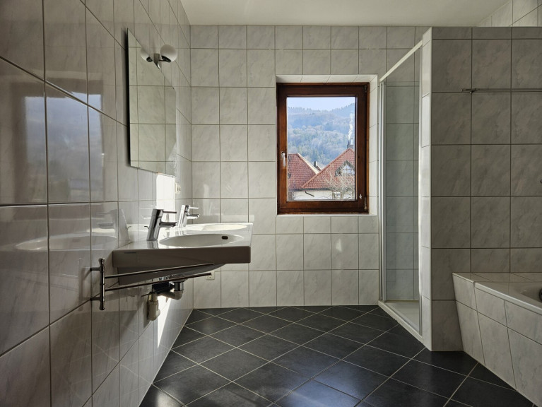 Das Badezimmer mit Fenster verfügt über Doppelwaschbecken, Badewanne, separate Dusche sowie ein WC und lässt somit keine Wünsche offen. Zwei weitere Einzeltoiletten sorgen dafür, dass kein Bedürfnisengpass entstehen sollte.