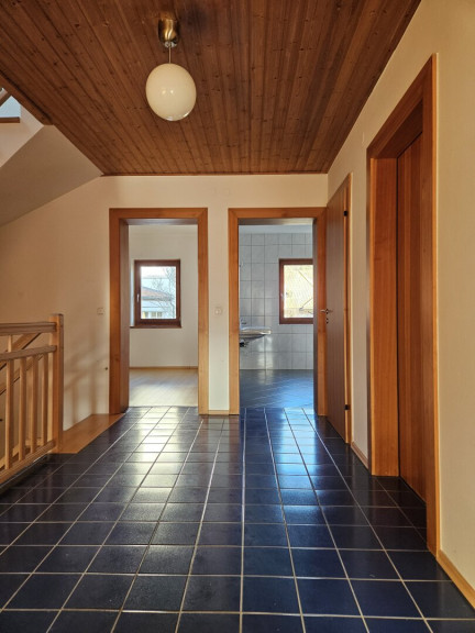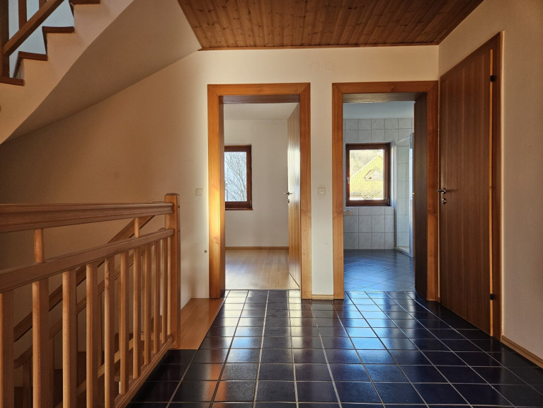 Von der geräumigen Küche wurde zusätzlich zum Fenster ein direkter Ausgang auf die rückwärtige Grundstücksfläche geschaffen. Von der Diele im Erdgeschoss wiederum lässt sich der geräumige Keller, welcher ausgiebige Stau- & Hobbyraumflächen bereitstellt, betreten. Zusätzliche Nutzfläche bietet das vollwertig über das Hauptstiegenhaus erschlossene Dachgeschoß.