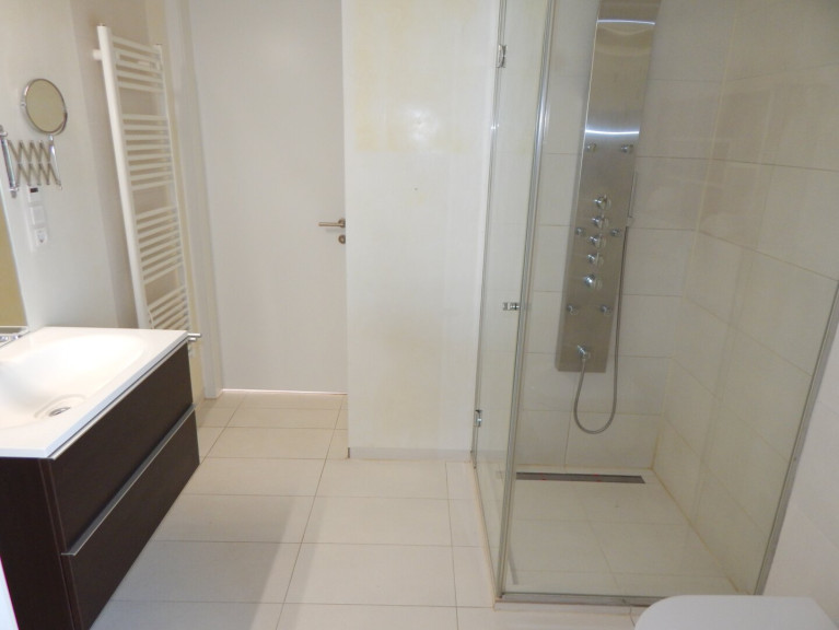 Podest mit Blick ins Wohnzimmer - Schlafzimmer mit Zugang zur Terrasse - Badezimmer mit Fenster, Dusche (Badewannenanschluss vorhanden), WC, Handwaschbecken - Abstellraum.