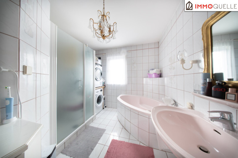 Linker Hand befindet sich das Badezimmer mit Badewanne und einem Fenster nach außen, das den Raum mit natürlichem Tageslicht erfüllt. Ergänzt wird dieser Bereich durch ein separates WC, das zusätzlichen Komfort im täglichen Leben bietet. Gegenüber befindet sich das Schlafzimmer, das mit seiner ruhigen Atmosphäre einen harmonischen Rückzugsort schafft.
