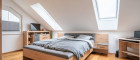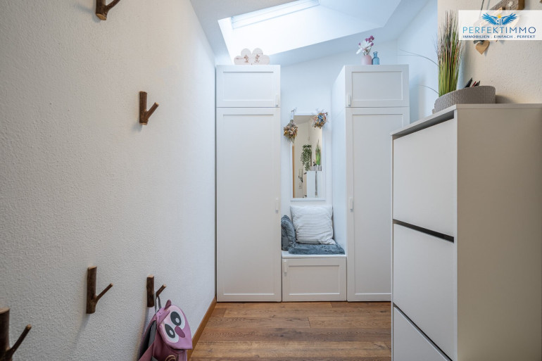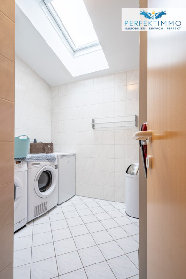 Die Einheit verfügt über drei gut geschnittene Zimmer und präsentiert sich insgesamt sehr geschmackvoll und zeitgemäß ausgestattet. Große Dachfenster lassen viel Sonnenlicht in die Räume und schaffen ein helles, freundliches Wohngefühl mit besonderem Charme. Das Badezimmer ist komfortabel ausgestattet und bietet sowohl eine Badewanne als auch eine Dusche sowie ein Fenster für natürliche Belichtung und Belüftung. Das WC ist separat ausgeführt. Zusätzlich steht ein geräumiger Abstell- beziehungsweise Wirtschaftsraum zur Verfügung, der wertvollen Stauraum im Alltag bietet.