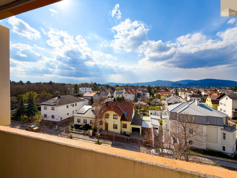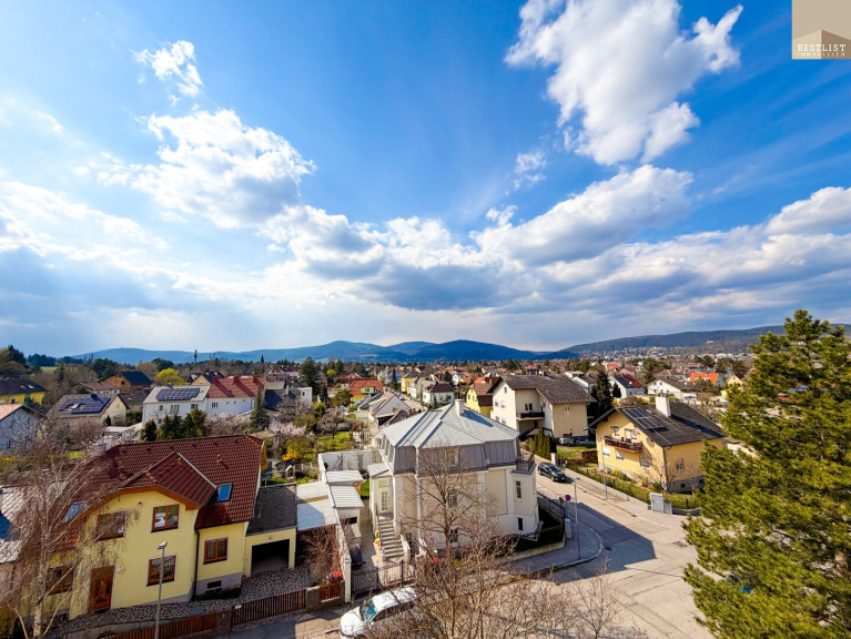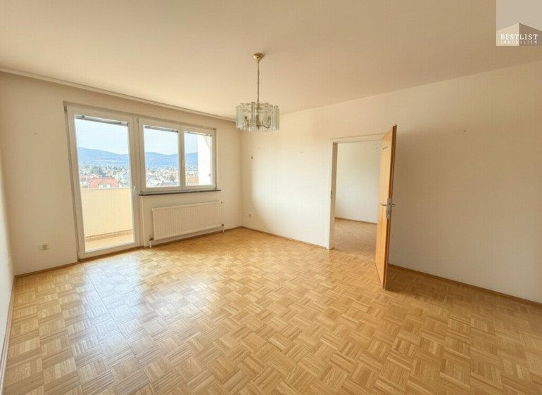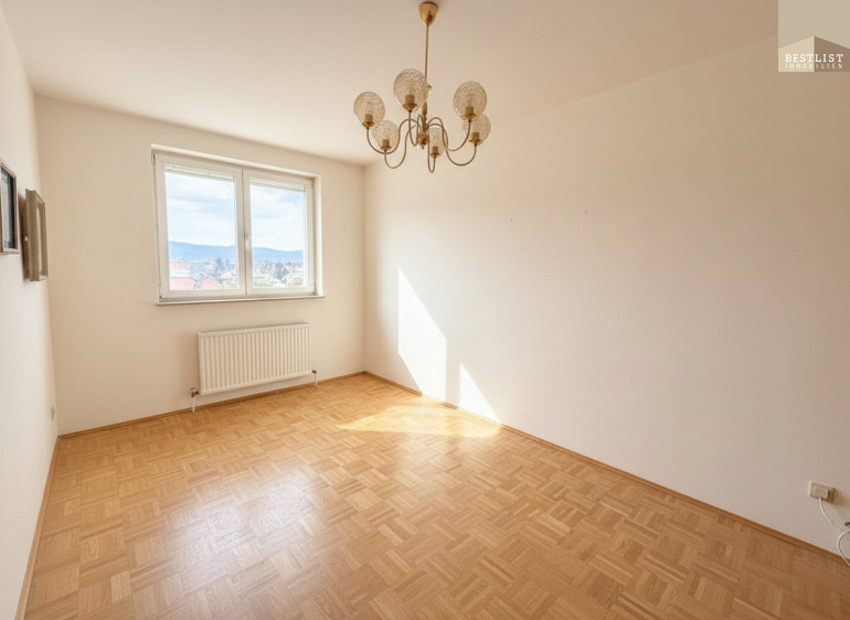 Rechterhand entlang des Flurs gelangt man in das helle und einladende Wohnzimmer mit direktem Zugang zur westseitigen Loggia. Diese bietet ideale Voraussetzungen für entspannte Abendstunden in der Sonne und eröffnet einen beeindruckenden Ausblick über ganz Baden – vom Mitterberg bis hin zum Schneeberg bei klarer Sicht.
