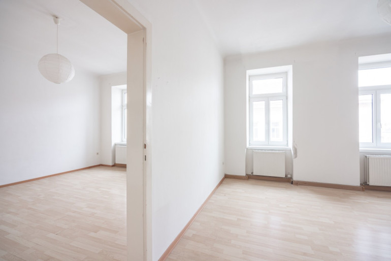 Diese 60 m² große Altbauwohnung bietet zwei großzügige Zimmer mit hohen Decken. Sie war bis vor kurzem vermietet und müsste daher saniert werden.