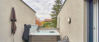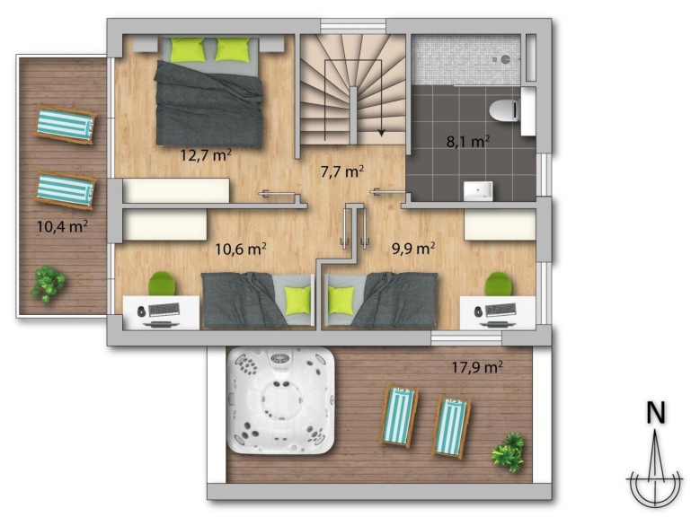 Im Obergeschoss erwarten Sie drei gut geschnittene Schlafzimmer mit direktem Zugang ins Freie. Zwei Zimmer verfügen über einen Westbalkon, während ein weiteres Highlight die großzügige Dachterrasse mit Whirlpool darstellt – ein privater Rückzugsort mit besonderem Mehrwert. Das moderne Badezimmer mit Dusche und Fenster rundet das Raumangebot ab.