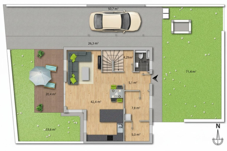 Herzstück des Hauses ist die helle, offen gestaltete Wohn- und Essküche mit edler Stein-Arbeitsplatte. Von hier aus gelangen Sie direkt in den sonnigen Westgarten – perfekt für entspannte Nachmittage und gesellige Abende. Ein zusätzlicher Raum im Erdgeschoss bietet flexible Nutzungsmöglichkeiten, ob als Homeoffice, Fitnessbereich oder Gästezimmer. Ergänzt wird diese Ebene durch eine praktische, lichtdurchflutete Tagestoilette.