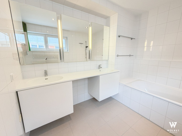 Über eine elegante Vollholztreppe gelangt man in das Obergeschoß, das über zwei Zimmer sowie ein Badezimmer mit Badewanne inkl. Dusche, 2 Waschbecken und WC verfügt.