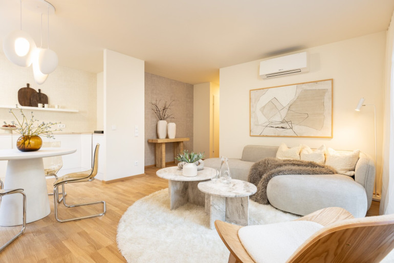 - Hochwertige Oberflächen wie Eichenparkett und 60×60 cm Feinsteinzeugfliesen