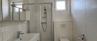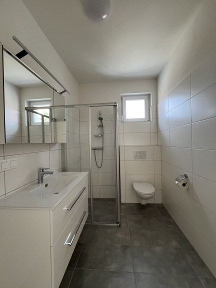 - Badezimmer mit Fenster, Dusche und Waschmaschinenanschluss