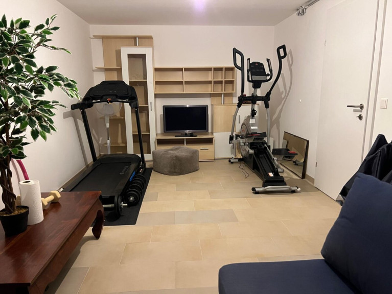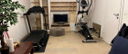 Verschiedene Fitnessgeräte (Laufband Crosstrainer, Standfahrrad, Hanteln)