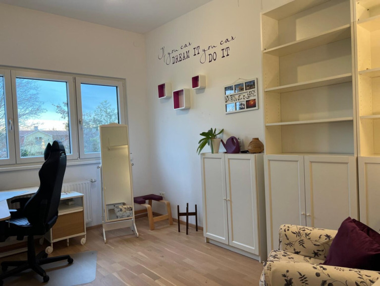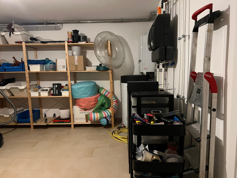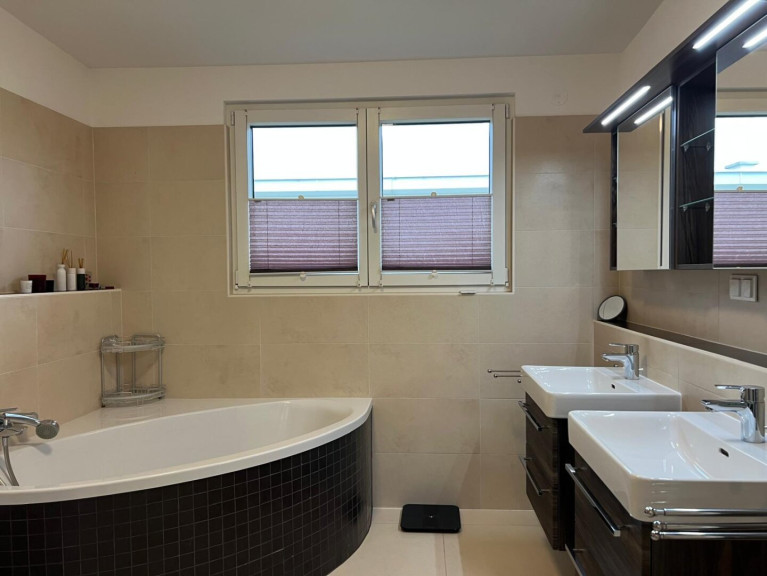 Vorraum, gegliedertes Wohnzimmer (Wohnbereich / Essbereich) mit offener Küche, kleiner Garten mit Swimming-Pool, Stiegenaufgang - oben offen zur Galerie, 3 Schlafzimmer (Schlafzimmer mit begehbaren Schrankraum, Kinderzimmer, Büro), geräumiges Bad (mit Fenster) mit 2 Waschbecken, Wanne, Dusche, WC. Keller: Wohn-/Fitness-/Hobby-Raum, großer Lagerraum mit Regalen mit Waschmaschine und Trockner, Haustechnik-Raum mit Lagerbereich (Regale) und Tiefkühlschrank.