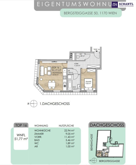 + TOP 16 / Dachgeschoss: Wohnfläche: ca. 51,77m² / 2 Zimmer / € 329.000.-