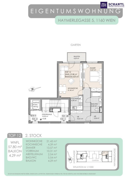 Wohnfläche: ca. 57,8m² + Terrasse: ca. 4,29m² + Kellerabteil + Garagenabteil optional