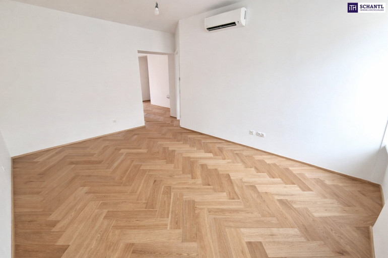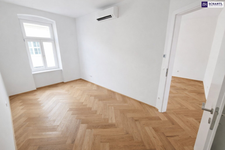 Ein hochwertiger Fischgrätparkettboden aus Eichenholz unterstreicht den klassischen Altbaucharakter, während Klimaanlagen in allen Wohnräumen für ein angenehmes Raumklima sorgen – zu jeder Jahreszeit. Beheizt wird die Wohnung über eine moderne Luftwärmepumpe, die sowohl umweltfreundlich als auch zukunftssicher ist.