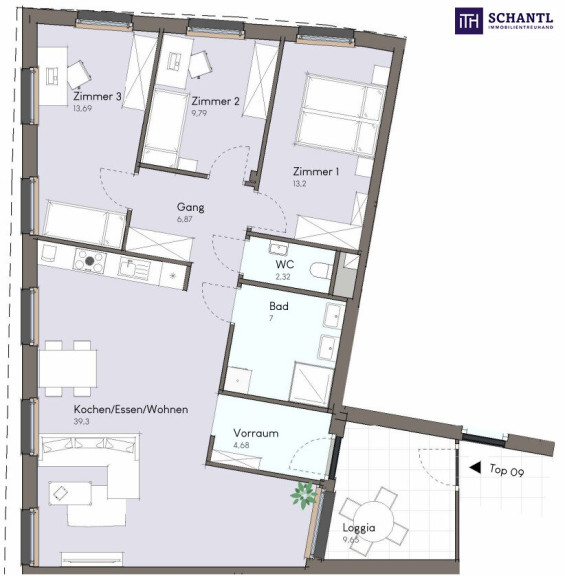- sonnendurchflutete Wohnküche mit Zugang zur gemütlichen Loggia