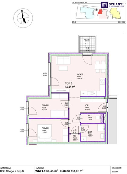 Wohnfläche: ca. 64,45 m² + Balkon: ca. 3,42 m² + Kellerabteil