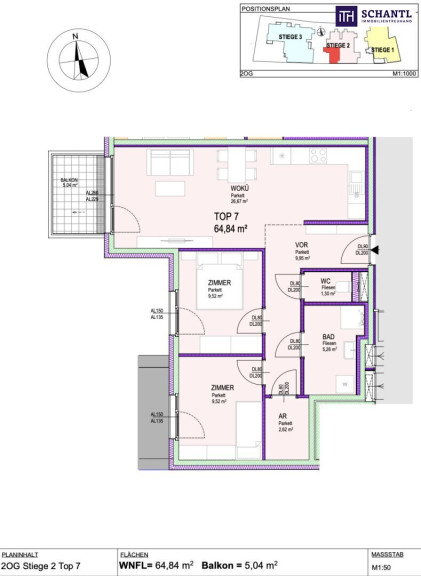 Wohnfläche: ca. 64,84 m² + Balkon: ca. 5,04 m² + Kellerabteil