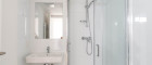 - Badezimmer mit Dusche, Waschbecken und Waschmaschinenanschluss