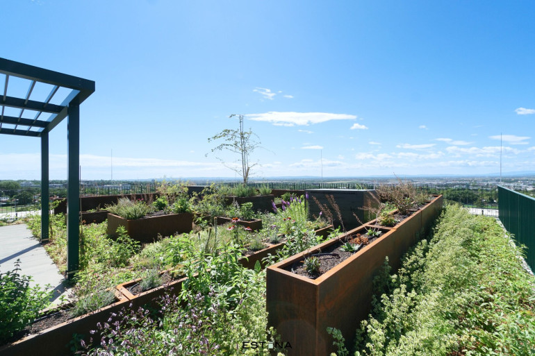 Eingebettet in die künstlerische Gartengestaltung von André Heller bieten die neuen Wohnungen einen großzügigen Blick in die weite Landschaft über die benachbarte Kleingartensiedlung. Das lebendige Farbenspiel der diversen Mosaikböden bei den Glashäusern und die mediterrane Bepflanzung im marokkanischen Garten schaffen eine harmonische Verbindung zwischen Architektur und Natur. Eine Allee aus Bambus bildet entlang der südlichen Grenze einen malerischen grünen Abschluss und eine geschützte Ruhezone für die Bewohner.
