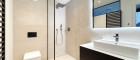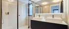 - Badezimmer mit Walk-In Dusche, Doppelwaschbecken und Toilette