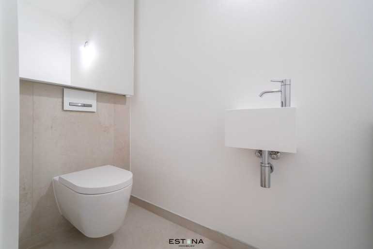 Offen geschnittene Grundrisse laden zur Geselligkeit ein, edle Naturholzböden mit langen Dielen verleihen dem Raum zusätzliche Großzügigkeit. Das Smart-Home System steuert das Zuhause auf Knopfdruck: Licht, Jalousie bis hin zur Heizung und Kühlung lassen sich hier koordinieren. Im Bad stehen gleich drei Ausstattungslinien mit unterschiedlichem Feinsteinzeug zur Auswahl: Der handgefertigte Charme von Marrazzis „Rice“, die unvergängliche Schönheit von Florims „Timeless“ Kollektion und die naturbelassene Anmutung der Serie „Pietre di Sardengna“ von Casalgrande Padana. Je nach Ausstattungslinie variieren auch Materialien und Farbe von Armatur, WC, Drückerplatte und Sprossenheizkörper.