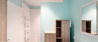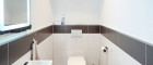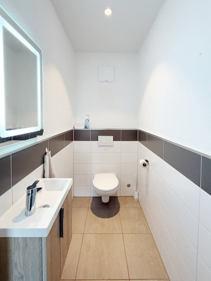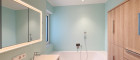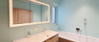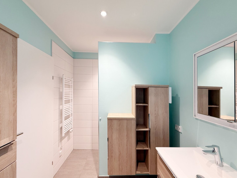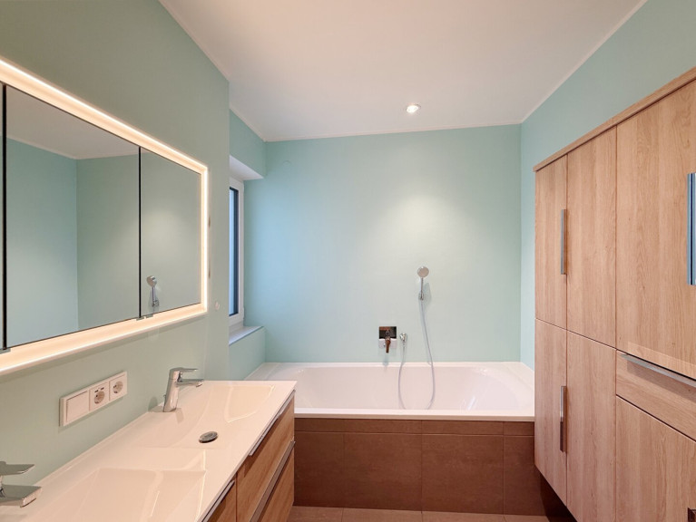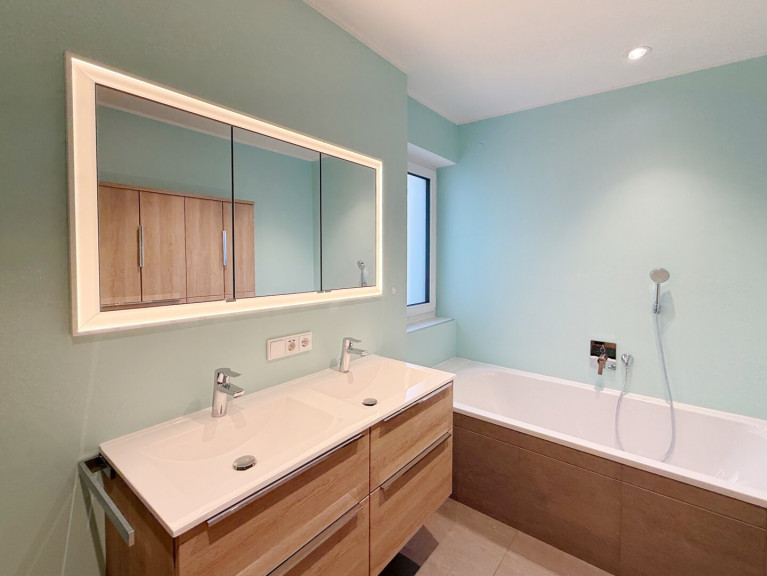 - Das Badezimmer ist mit Wanne, Dusche, 2 Waschbecken, Handtuchwärmer, versenktem Spiegelschrank und Badmöbeln komplett ausgestattet