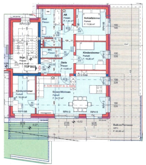 Raumaufteilung: Wohnküche, Schlafzimmer, 2 Kinderzimmer, Bad mit Wanne und Dusche, WC, Abstellraum und Diele