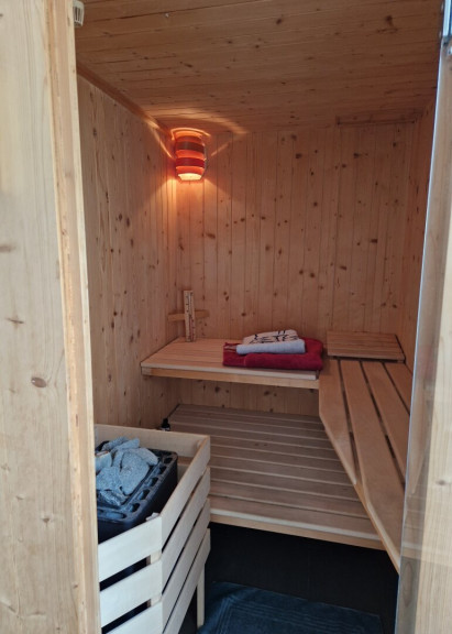 Das Badezimmer ist das absolute Highlight dieser Wohnung: Auf über 10 m² mit Fenster finden Sie eine Badewanne, die Dusche, Waschmaschinenanschluss, maßgefertigte Wäschekästen sowie eine Sauna.