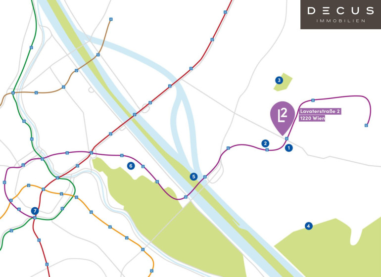 Das Wohnbauprojekt ist ideal gelegen, direkt an der U2-Station Aspernstraße sowie der Buslinie 26A. Mit den öffentlichen Verkehrsmitteln gelangt man in knapp 15 Minuten ins Stadtzentrum.