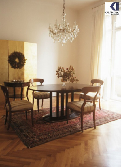 Großes zentrales Vorzimmer, 1 großer Salon, 1 Speisesalon nahe der Küche mit offenem Kamin und kleinem Balkon, 2 große Schlafzimer, 1 großes Wannenbad, Komplettküche, Extra-WC.
