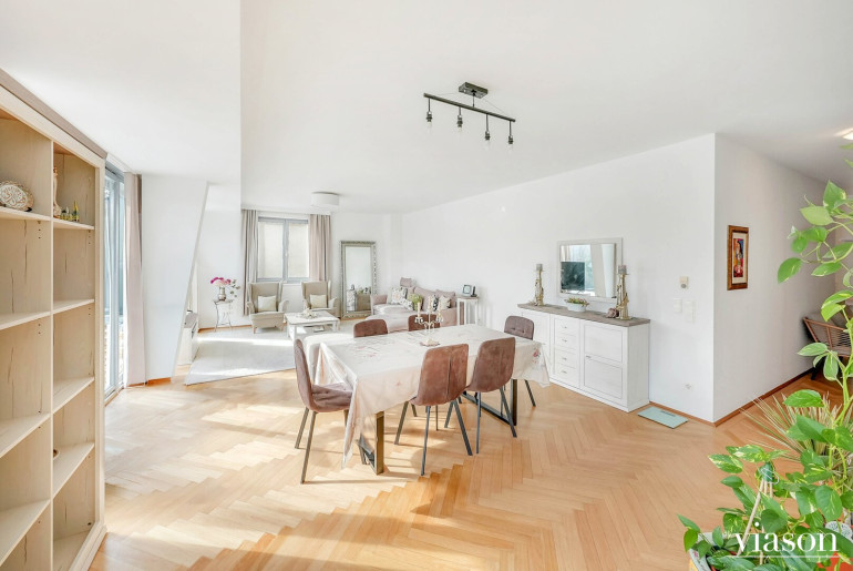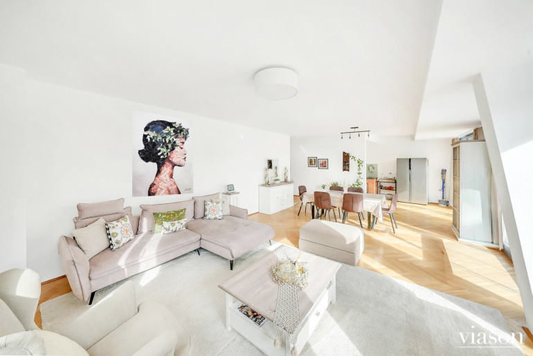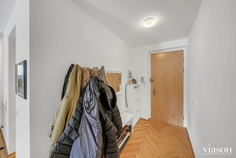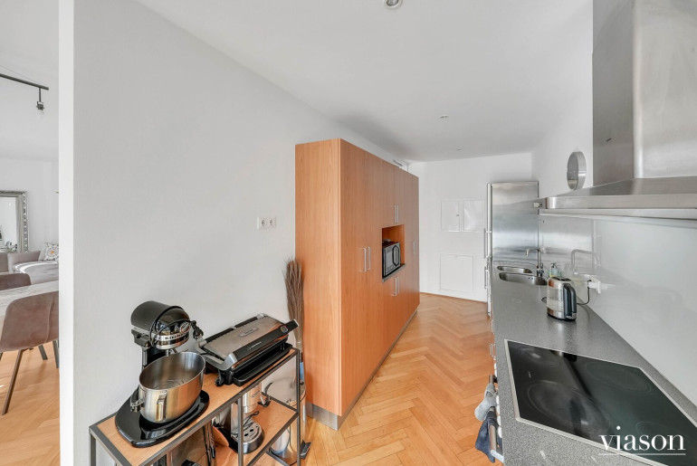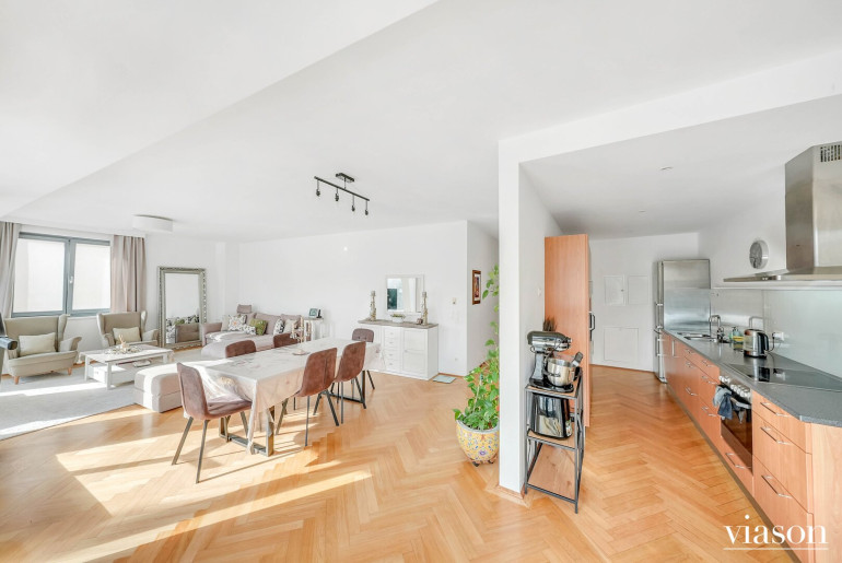 Vom einladenden Vorzimmer gelangen Sie in das Herzstück der Wohnung: die beeindruckende, ca. 57 m² große, sonnendurchflutete Wohnküche. Die Küche ist geschickt durch eine Trennwand teilsepariert, was für eine klare Struktur sorgt, ohne die Offenheit zu verlieren.