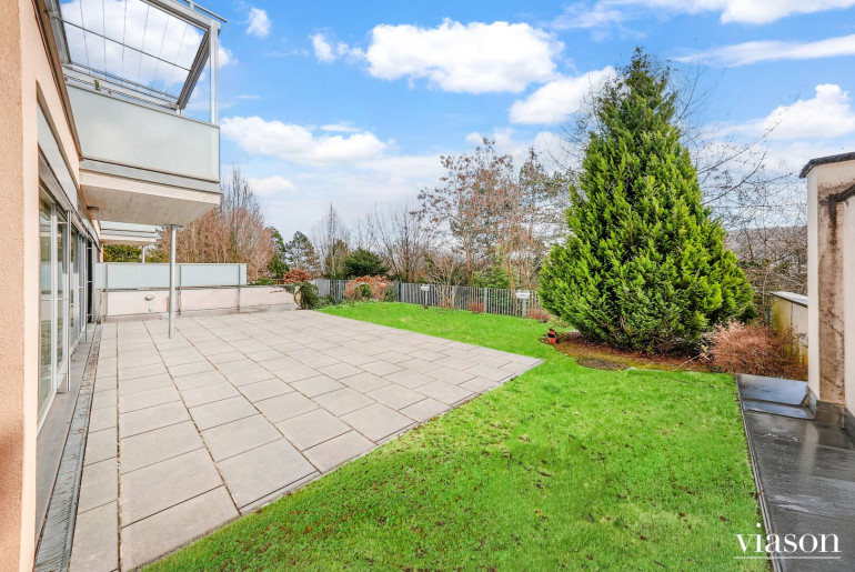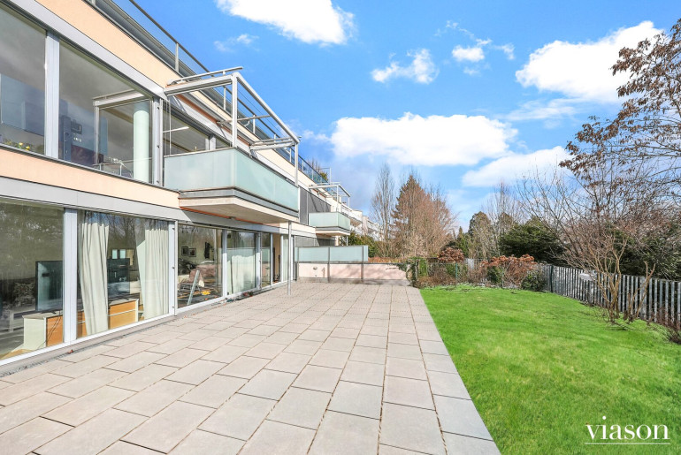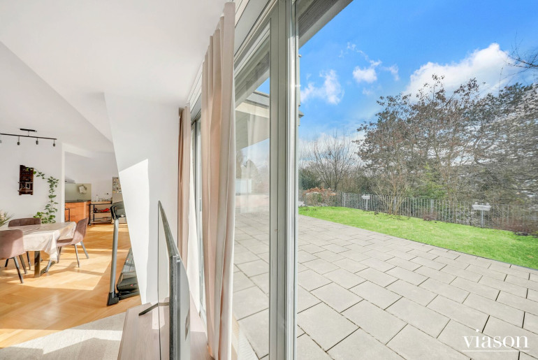 Von hier aus betreten Sie die sonnige Südterrasse und den angrenzenden Garten – eine grüne Oase mit herrlichem Ausblick, die zum Entspannen einlädt.