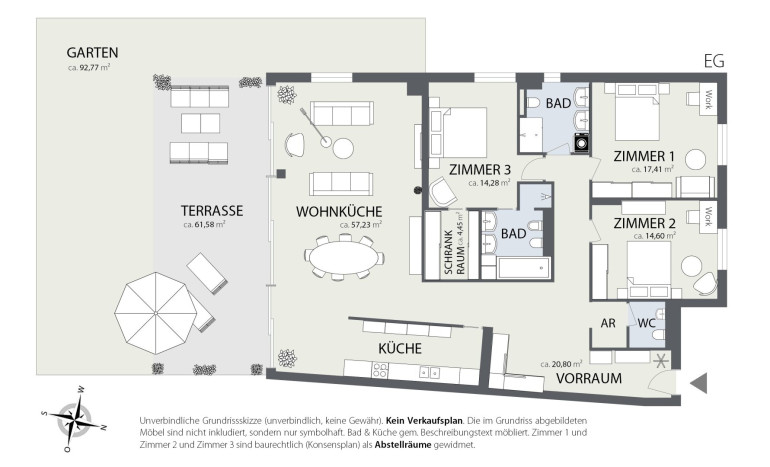 - Freiflächen: ca. 61,58 m² Terrasse & ca. 92,77 m² Eigengarten