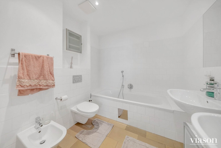 - 2 BADEZIMMER: Badezimmer 1: Dusche, 2 Waschbecken, WC, Waschmaschine samt Trockner; Badezimmer 2: Badewanne, WC, Bidet, 2 Waschbecken, Dusche