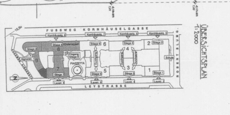Die Wohnhausanlage zwischen Kornhäuselgasse und Leystraße wurde in den 1990er Jahren errichtet. Auf insgesamt 9 Stiegen verteilen sich neben zahlreichen Eigentums- und Mietwohnungen auch mehrere Nahversorgungsmöglichkeiten, darunter ein BILLA, ein BIPA, eine Trafik sowie ein Restaurant.