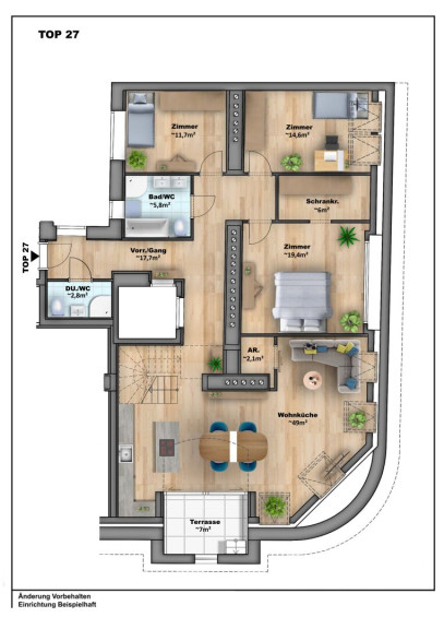 - Top 27: Wfl.: ca. 130,8m²; 4 Zimmer; Terrassen: ca. 54,4m², Kaufpreis (belagsfertig): 1.249.000,-- Euro, Kaufpreis (schlüsselfertig): 1.389.000,-- Euro