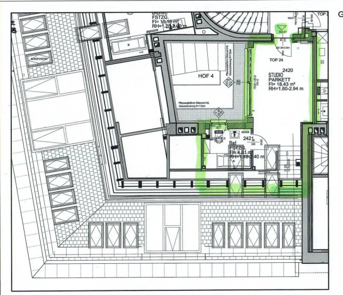 Im Obergeschoß gelangt man vom 2. Eingang in einen großzügigen Galerie-Raum/Studio (18,43 m²) mit eigenem Bad - ideal als Büro oder Gäste/Personal-Wohnung (kann auch zur Wohnun abgetrennt werden!).