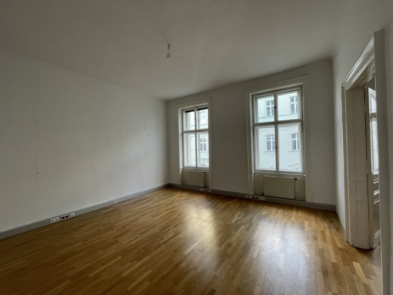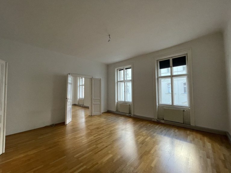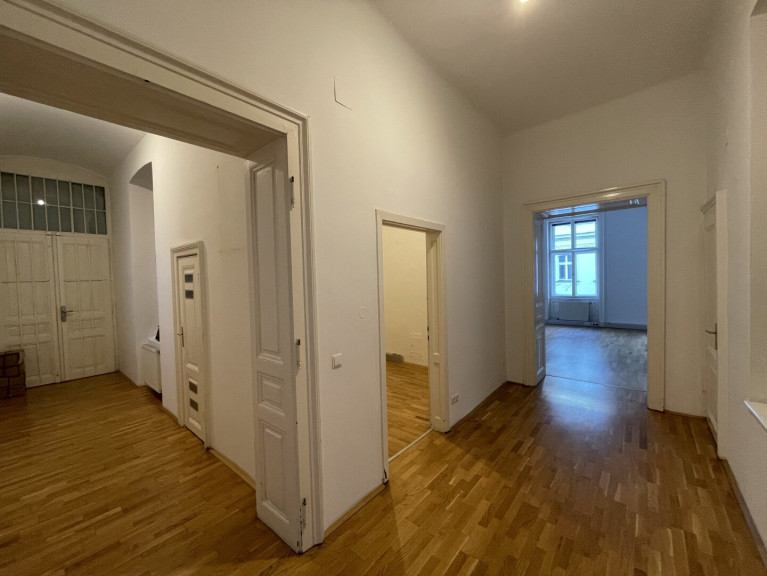 Vom zentralen Vorraum gelangt man in die 4 Büroräume, die Küche und das WC.Alle Zimmer sind altbautypisch geräumig, haben hohe Räume, einen schönen Parkettboden und alte Türen.