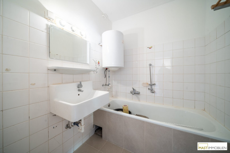 Das Badezimmer ist voll funktionsfähig und muss grundsätzlich nicht saniert werden. Besonders hervorzuheben ist der neu verlegte Parkettboden, der sich durch die gesamte Wohnung zieht und für eine hochwertige Wohnatmosphäre sorgt.