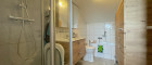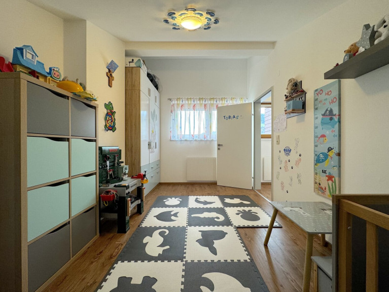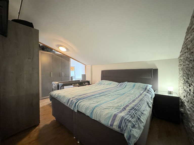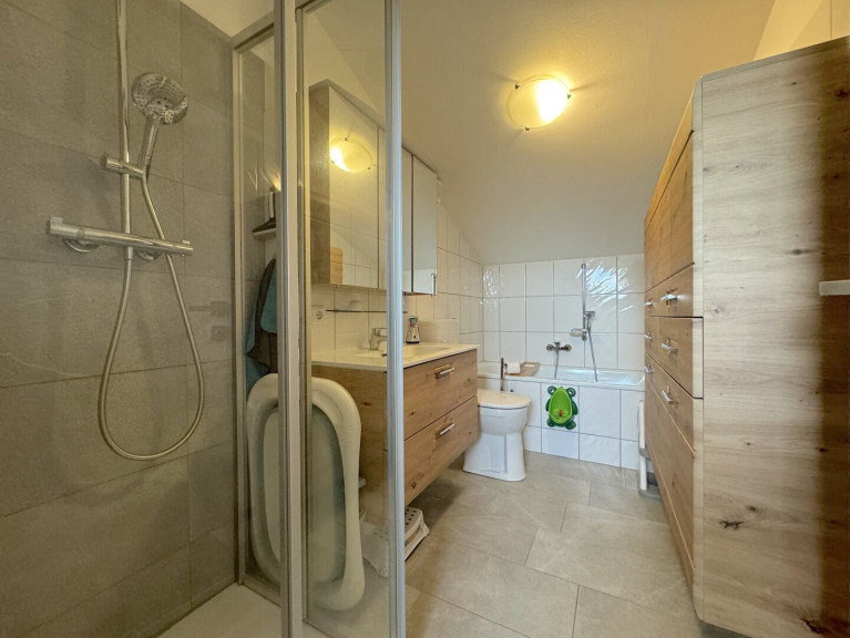 Im Obergeschoss der Wohnung befinden sich zwei Schlafzimmer, das Badezimmer mit Badewanne und Dusche, die Küche und der Essbereich.