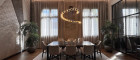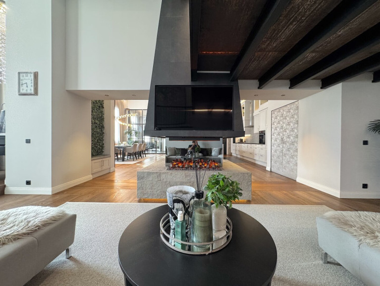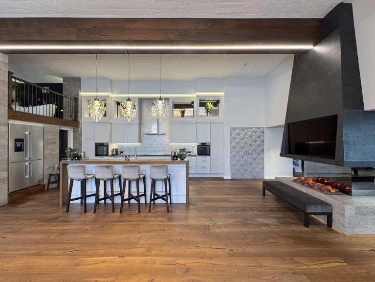 Essbereich: Durch einen attraktiven verglasten Raumteiler betritt man den Essbereich mit einer voll ausgestatteten Designküche. Eine moderne Inselküche mit Natursteinoberflächen, integriertem TV und edlen Beleuchtungselementen bildet das Herzstück. Ergänzt wird sie durch ein optisches Ambiente-Feuer, das für stilvolle Stimmung sorgt.