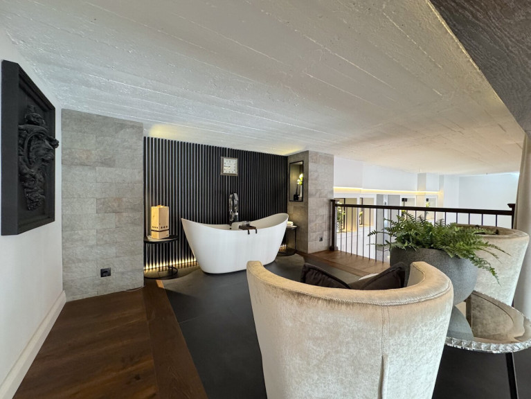 Eingangsbereich: Eingebaute Garderobe bzw. Schrankraum sowie ein elegantes Badezimmer mit Doppeldusche und separatem WC. Das Badezimmer ist mit hochwertigem silbergrauem Feinsteinzeug und passendem Interieur ausgestattet. Über eine Treppe gelangt man zur freistehenden Badewanne auf der Galerieebene.
